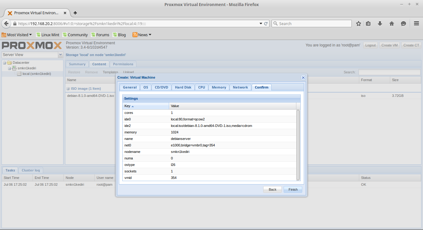 - Setelah selesai pembuatan VM, VM tersebuat akan muncul di Datacenter yang di proxmox dengan identitas 354.